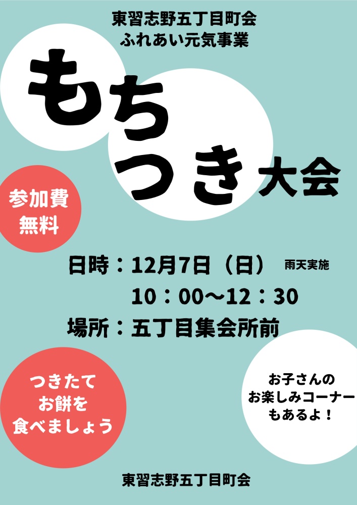 令和6年12月8日・日曜日に東習志野5丁目集会所前で「東習志野五丁目町会ふれあい元気事業・令和6年度餅つき大会」が開催されました。つきたてのお餅をその場で食べて、何個でもおかわりができ、参加者はお腹いっぱいになりました。射的大会や輪投げコーナーも設けられ、多くの子どもたちが楽しみ、笑顔があふれる素敵な一日となりました。(お餅・輪投げ・射的は無料です)