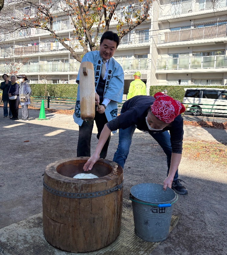令和4年12月11日・日曜日、東習志野5丁目集会所前のマラソン道路で「五丁目町会ふれあい元気事業・餅つき大会」が開催されました。このもちつき大会は、習志野市の『高齢者ふれあい元気事業』の一つで、習志野市より助成金が支給されます。来賓として、習志野市議会の清水大輔議長も杵(きね)を持ってもちつきに参加しました。昨年同様、「会場での飲食は中止」となり、つきたてのお餅はご自宅へ持ち帰って食べていただく事となりました。抽選会も開かれ、多くの子どもたちの笑顔を見ることが出来ました。